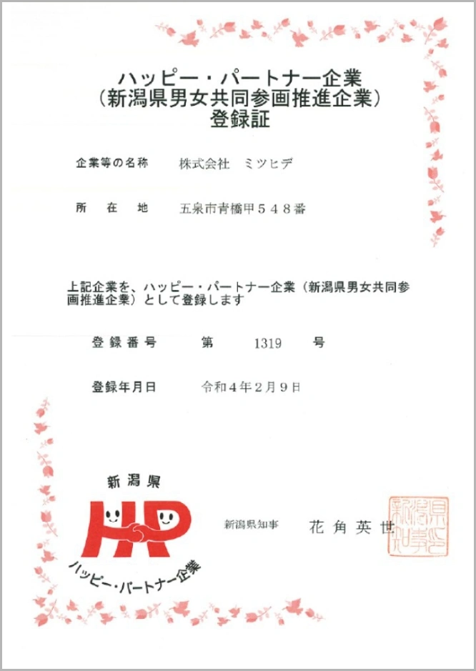 男女がともに働きやすく、仕事と家庭生活等が両立できるよう職場環境を整え、女性労働者の育成・登用などに積極的に取り組む企業として「ハッピー・パートナー企業(新潟県男女共同参画推進企業)」に登録し、その取組みを積極的に行っています。