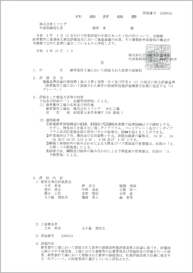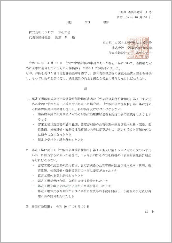 - (社)全国鐵構工業協会 性能評価適合工場