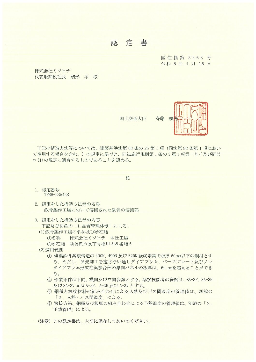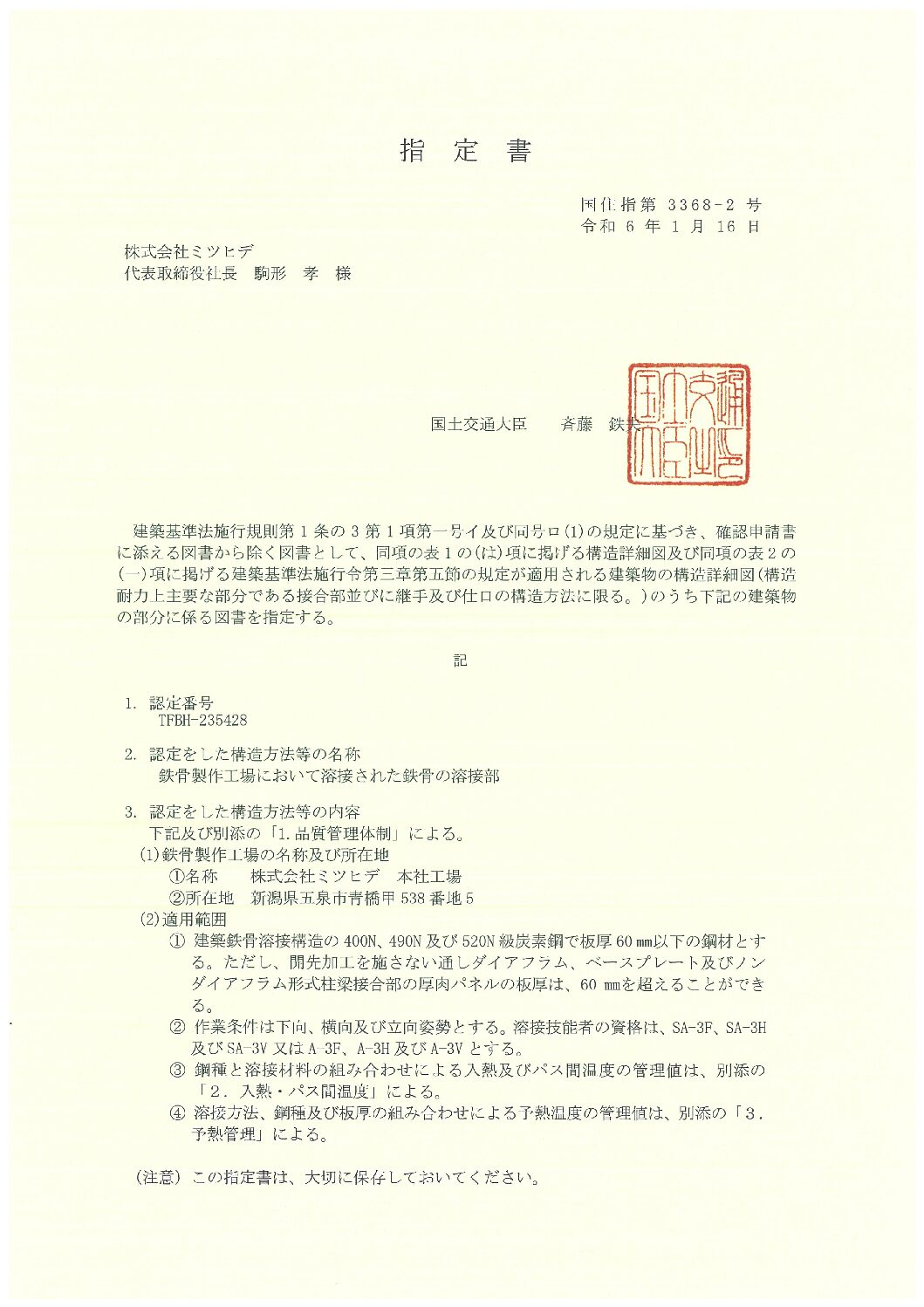 - 国土交通大臣認定番号
